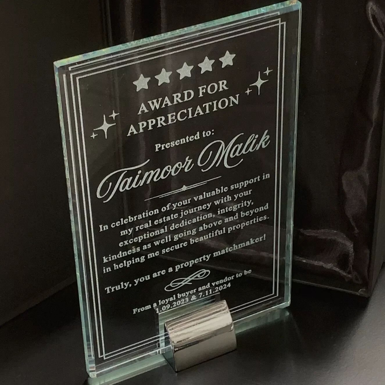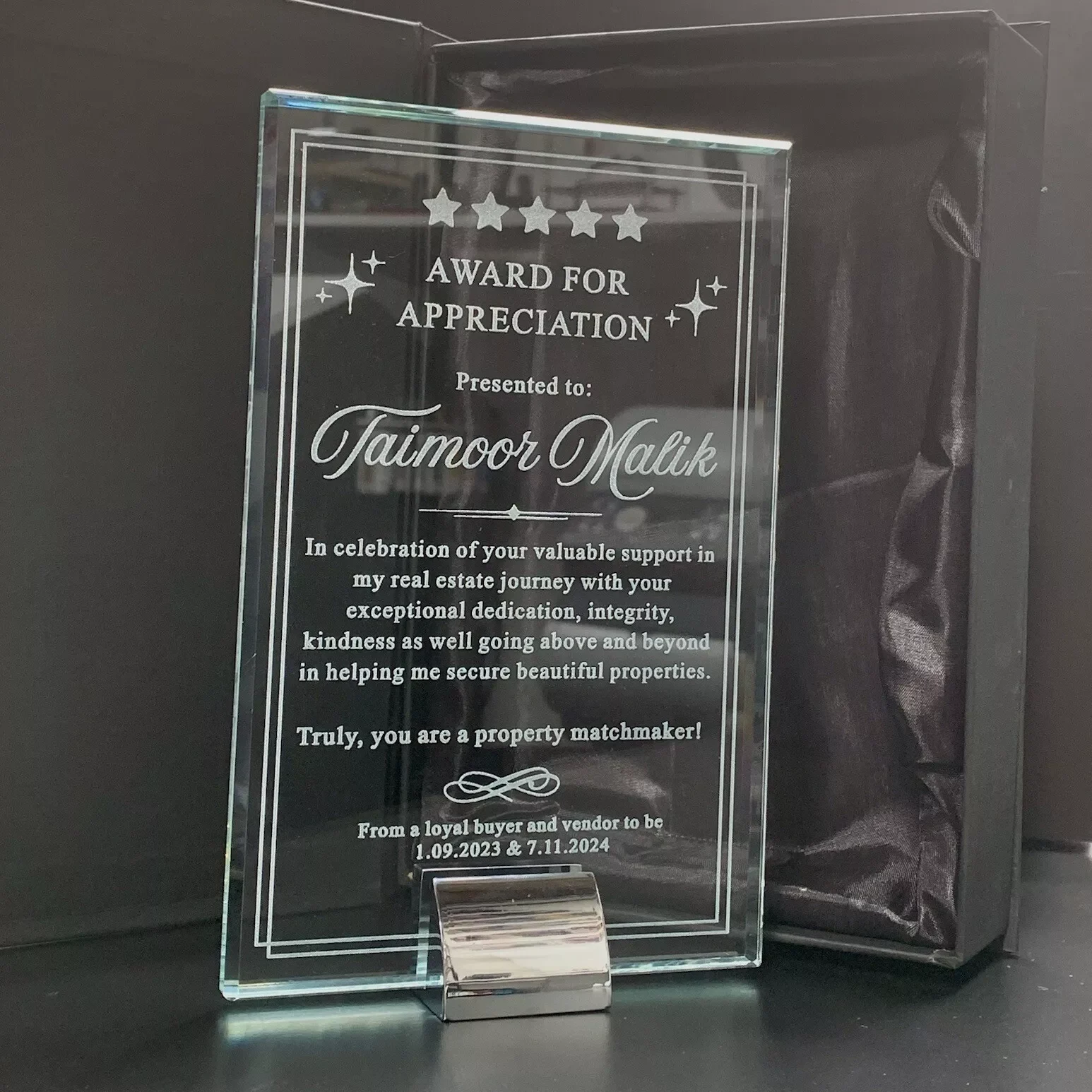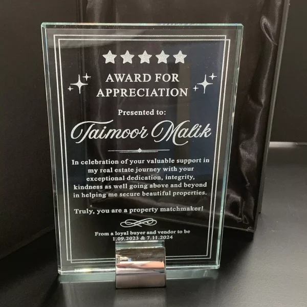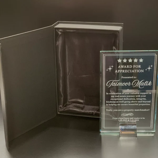 - Manufactured from GLASS AND METAL, this Award would look stunning in any office or display cabinet.