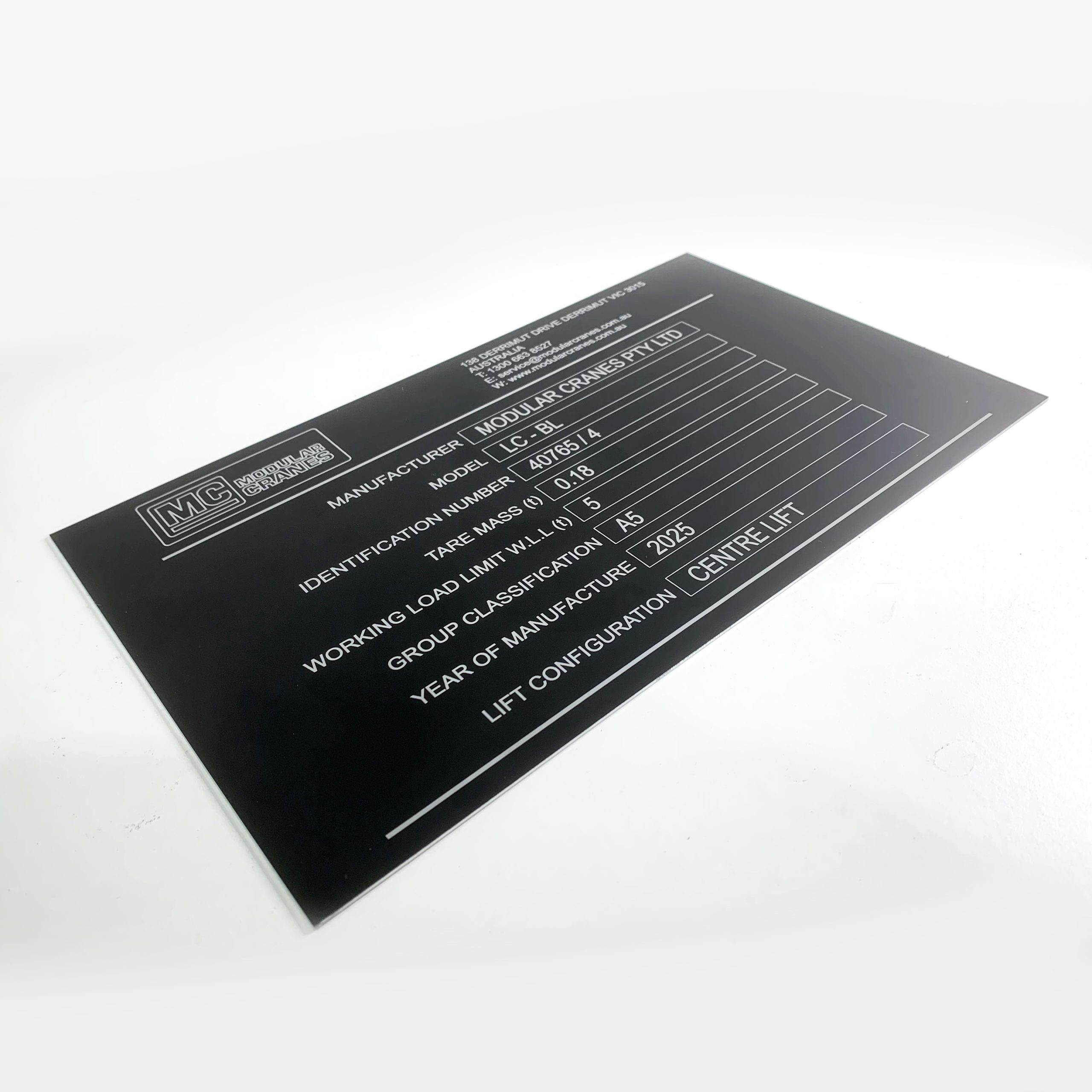 - LASER ENGRAVED METAL EQUIPMENT CRANE TRUCK COMPLIANCE PLATE LARGE Please contact us if you need a large quantity.