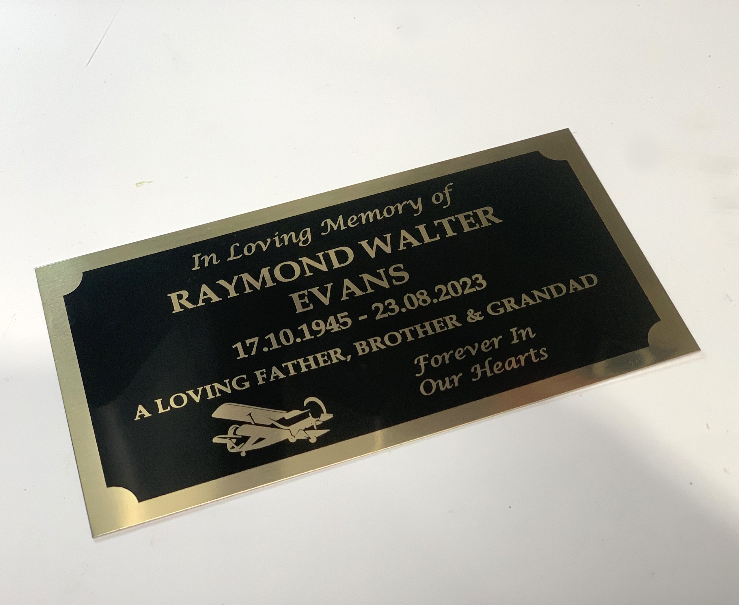 • Metallic coloured memorial plaque made of Aluminium. Custom laser engraved with your choice of font. Available in Gold, silver, black and white metals